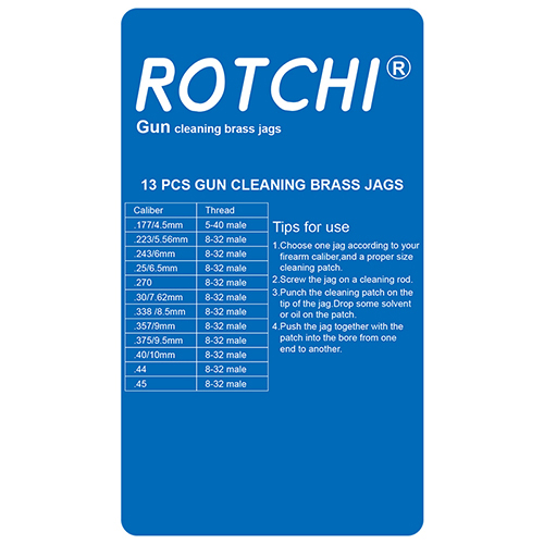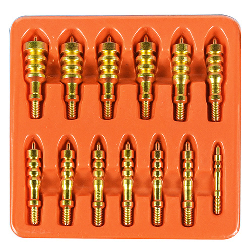 13-osaline püstol, mis puhastab messingist sakke komplekt, blisterkaardi pakend, suurused: 0,177, 0,22, 6 mm, 0,25, 0,27, 0,30, 0,338, .35, .357, .40, .44, .45, .50kal.
