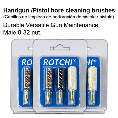 Käsipüstoli puhastushari 3-in-1 komplekt, blister ja kaart pakett. Saadaval suurused: .22, 9mm, .40, .45cal.