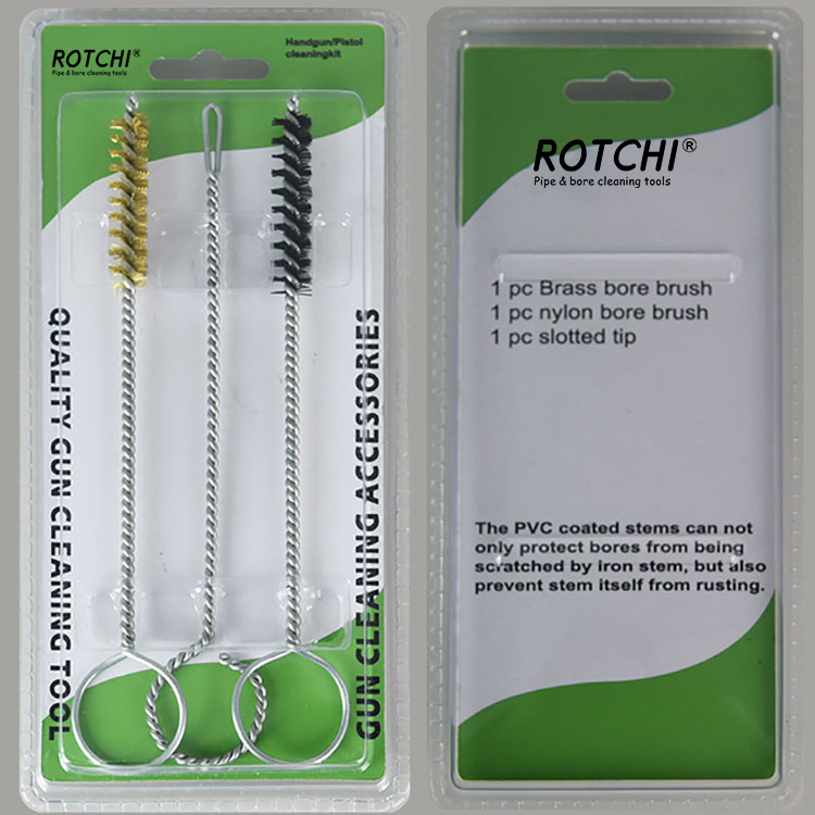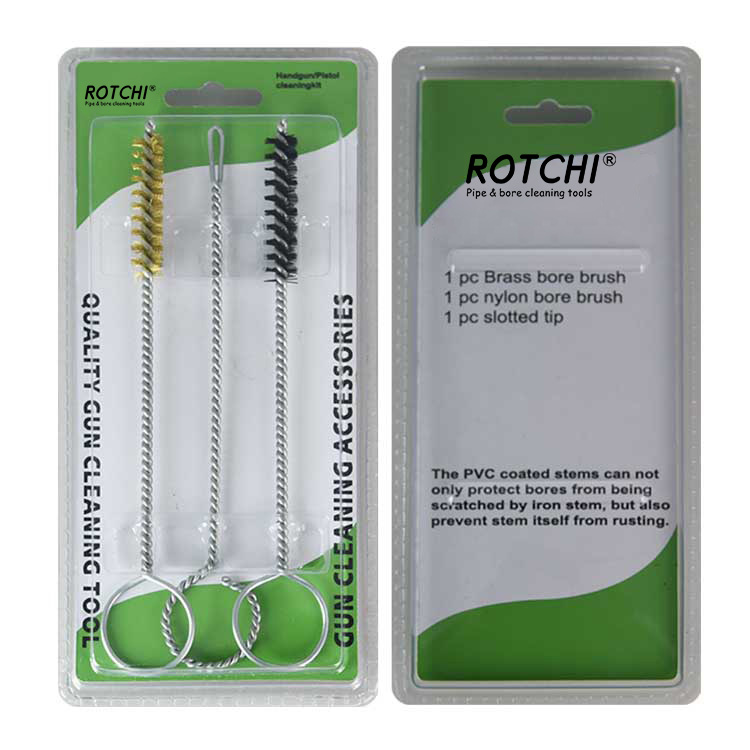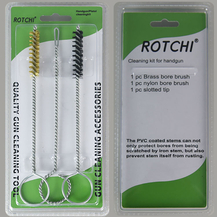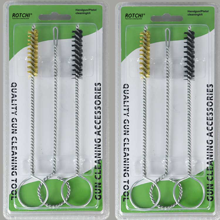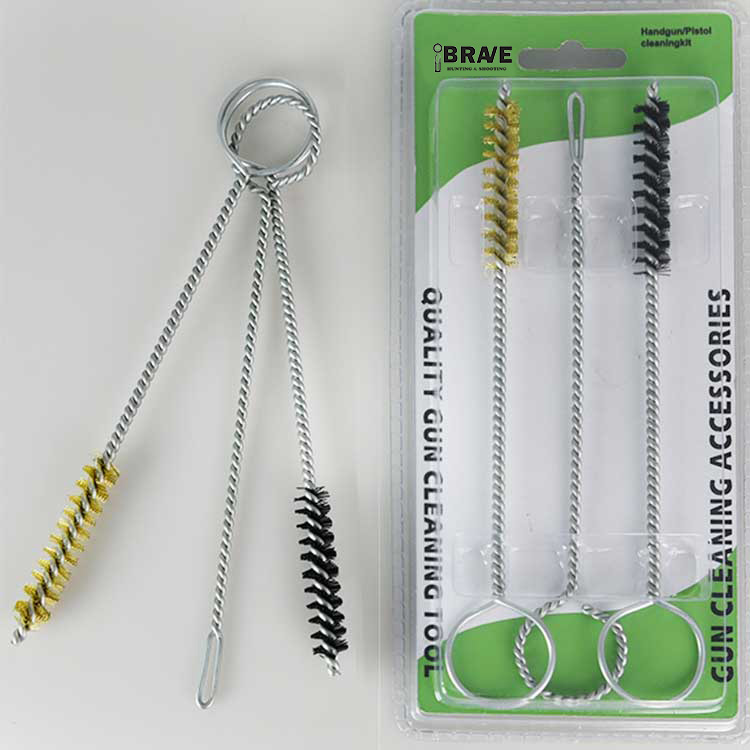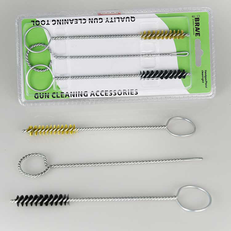 9 mm käsirelvade puhastuskomplekti mullpakend 3 tk sethandgun puhastuskomplekt, pakitud topeltblistrisse. Üks messingist puhastushari, üks nailonist puhastushari ja üks piludega plaastrihoidja. Käepärane ja tõhus.