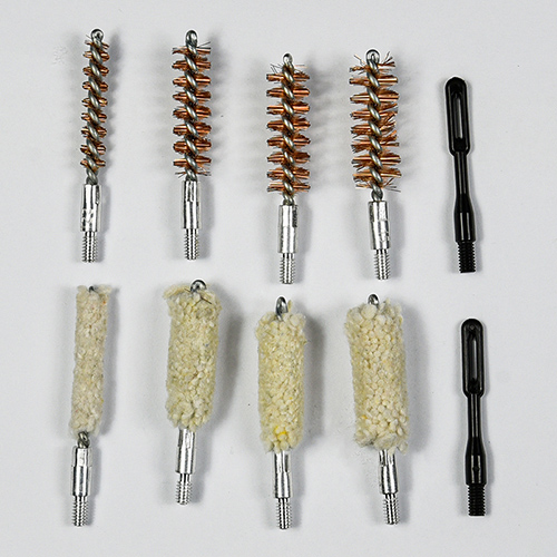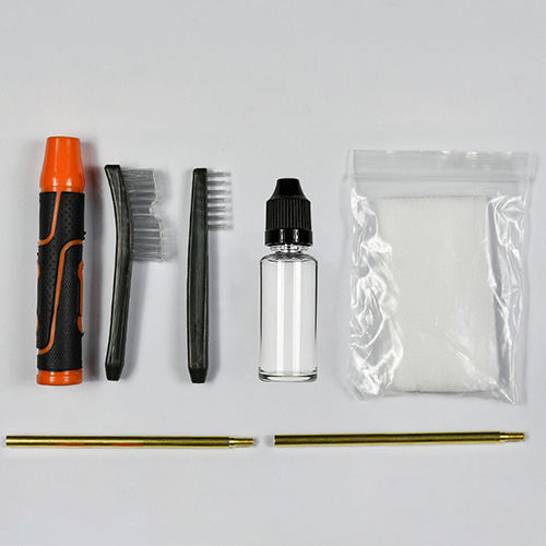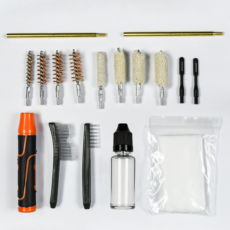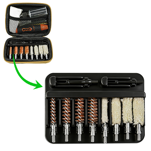 Käsirelva puhastuskomplekt sisaldab 4 suurust (.22, 9mm, .40, .45cal.). OX riidega kaetud PVC ümbris lukuga. Messingist harjad ja puuvillased mopid, 2 varrast. Liivad ja mustad värvi valikute jaoks.