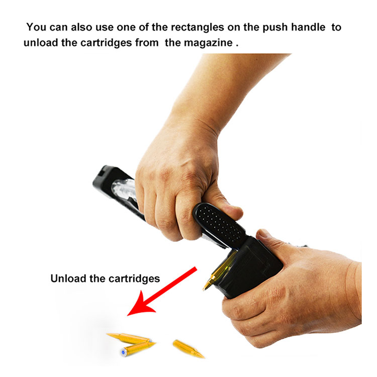 Ajakirjade kiirlaadur AR15 jaoks ● Kasutatakse 5,56 x 45 mm kassettide laadimiseks AR-salve, mille maht on 10/20/30 või rohkem. ● Täitke kassetid soones täis, paigaldage salv samamoodi nagu AR mehaanilise põhimõttega. suruge tõukurit, kassetid sisenevad kergesti salve. ● Lihtne kasutada, tüdruk saab väga kiiresti hakkama. ● Tugev keha. Läbi läbipaistva katte näete laaduri sees olevaid padruneid. Lukk kontrollib, et kate ladustamise ajal ei avaneks. ● See võib kassetid salvest välja laadida ka siis, kui te ei pildista, kuid salv on ikka täis.
