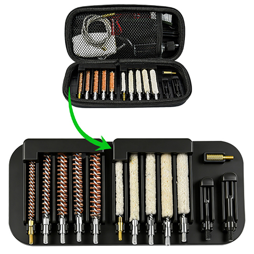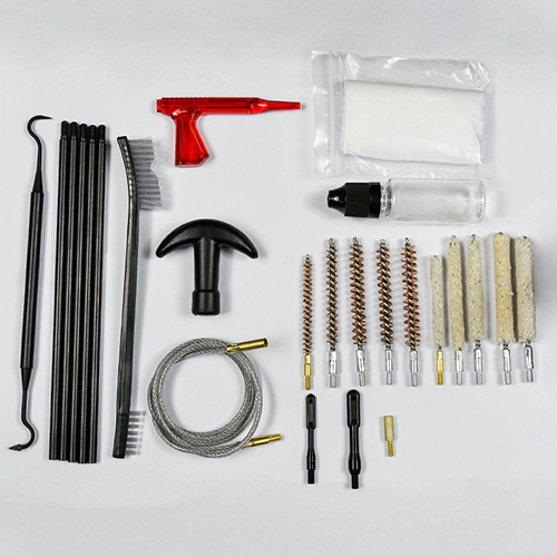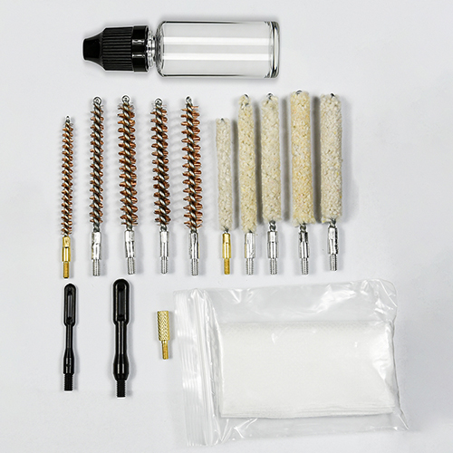 Püssi puhastuskomplekt sisaldab 5 suurust (.177, .22, .243, .27, .30 cal.), messingharju ja puuvillased mopid, 5 varrast, 2 tk. Liivad ja must värv valikuteks.