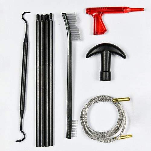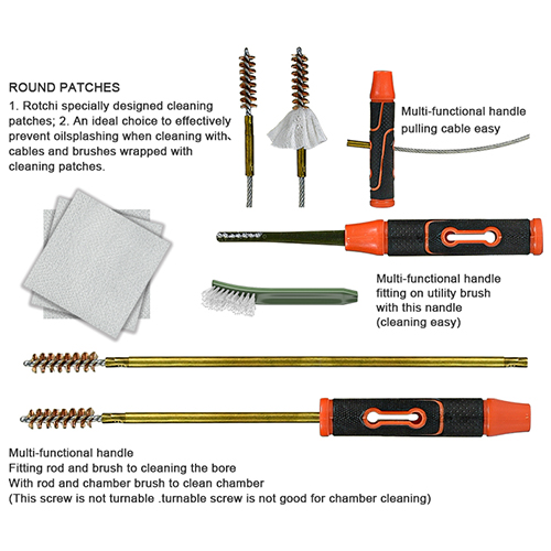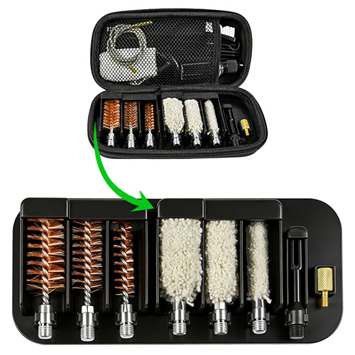 Haavlipüssi puhastuskomplekt sisaldab 3 suurust (12/16G, 20G, 410). Messingist pintslid ja puuvillased mopid, 4 varrast 1 kaal. Liivad ja must värv valikuteks.